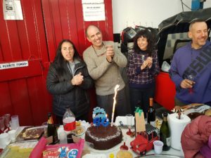 Gabriel y sus seres queridos, muy sonrientes frente a la torta. En la foto principal, el frente del taller, el día del aniversario. Fotos: cortesía facebook Gabriel Tomalino.