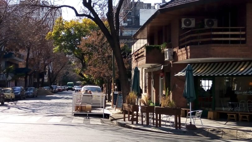 Continúa la tendencia de colocar mesas en el exterior de los locales gastronómicos, en espacios «ganados» a la calzada. Aquí, lo observamos en Teodoro García y Zapiola, donde hay una cafetería que hace varios días, también cuenta con esta ampliación.