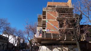 Conde y Virrey Arredondo. Este edificio en construcción fue decorado con dibujos multicolores en su primer piso. En ese contexto, también se logra apreciar la figura de un mono, pintado sobre un fondo beige.