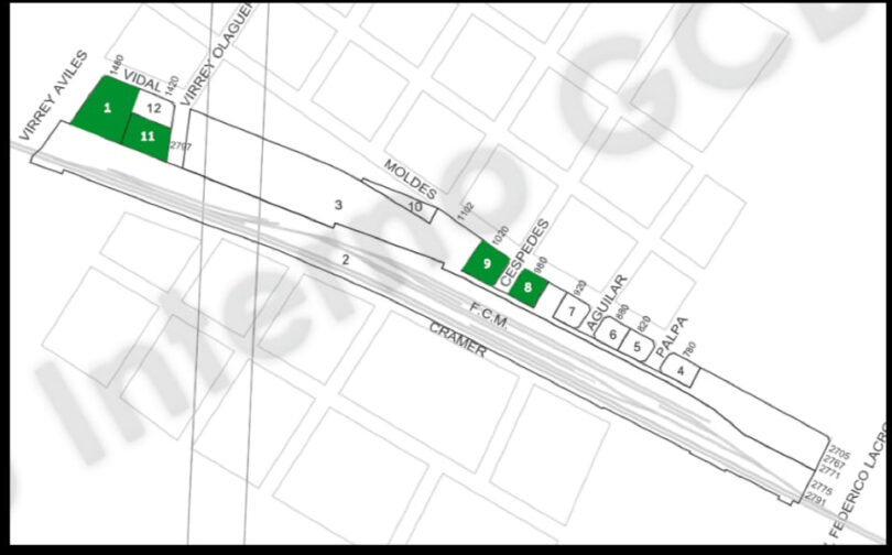 Foto: un esquema del Parque Ferroviario, con los lotes en conflicto pintados de verde (agradecimiento: Adriana Fernández).