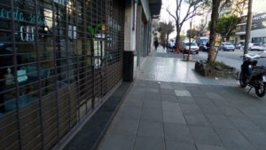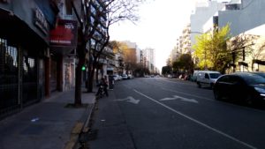 Tras el cruce con Céspedes el panorama cambia. En la esquina se ve gente esperando el colectivo y ya hay comercios abiertos, como un par de verdulerías, una de cada mano de la avenida. Un hombre, subido a una escalera, trabaja en la puerta de un edificio. Muy cerca, siempre de la vereda de numeración par, dentro del campo visual aparece una obra en construcción, aunque todavía no se observa actividad en ella. Un cartel en un poste dice: “Distrito audiovisual”. Por Gregoria Pérez, un hombre cruza rápidamente la avenida en monopatín. No va solo: en sus espaldas lleva una mochila infantil, y delante de él, viaja un nene (o una nena).