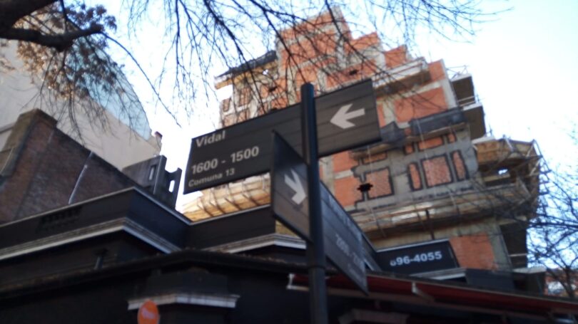 Enfrente, demolieron una casa que ocupaba la ochava. Pronto se levantará allí otro edificio. El cartel inmobiliario que lo anuncia, señala el punto como perteneciente al barrio vecino (se lo anuncia como “la mejor esquina de Belgrano”), pero la jurisdicción es claramente colegialense. No es la única confusión al respecto. Sobre Vidal, entre Avilés y Virrey del Pino –mano derecha- sobrevive un cartel comercial de un desaparecido local de artículos de camping, cuyo nombre de fantasía también hacía referencia a Belgrano.