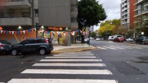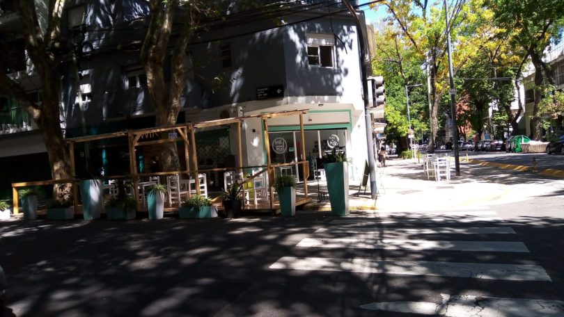 En Colegiales, al igual que en otros sectores de la Ciudad, más y más locales gastronómicos adoptan la medida de ocupar parte de la calzada con mesas y sillas. Aquí, vemos otro ejemplo, en Olleros y Ciudad de la Paz.
