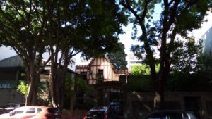 Delgado entre Céspedes y Palpa. La particular planta alta de una casona asoma por entre el follaje de los árboles. Se trata del gimnasio y complejo de padel La Normanda, histórico en el barrio. La antigua propiedad no fue demolida en su totalidad cuando a principios de los Noventa, construyeron el centro deportivo.