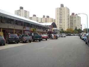 Paisajes de mi barrio. La calle Martínez, entre el Mercado de Pulgas y el predio donde hoy está la plaza Clemente. Al fondo las torres que ocupan la manzana entera de Álvarez Thomas-Concepción Arenal-Santos Dumont y Enrique Martínez.