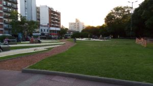 Atardecer en la plaza San Miguel de Garicoits, uno de los espacios verdes del barrio. Cuando la luz del día cede ante las primeras sombras de la noche, los vecinos encuentran aquí un atractivo lugar para reunirse.