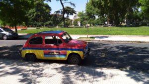 Giribone entre 14 de Julio y Heredia. Un antiguo Fiat 600 ploteado con la publicidad de Anilinas Colibrí, histórica empresa de la zona.