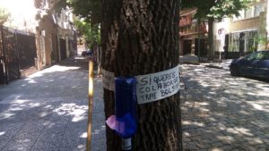 Otra muestra de la «lucha» contra las deposiciones de los perros en las veredas del barrio. Este dispositivo con bolsas y un letrero que invita a los dueños de las mascotas a no permitir que éstas ensucien, está en Virrey Arredondo y Conde.