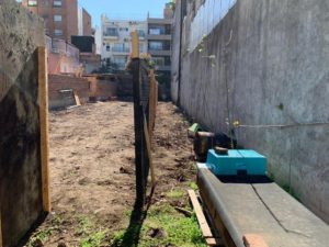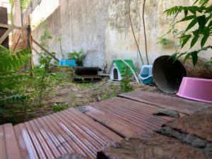 -Uno de los puntos que consensuamos con Santiago, fue el de habilitar una franja a lo largo del baldío, separada mediante una mediasombra para que los gatos transiten por ahí y accedan a la vereda, que es donde reciben alimento y agua. A ese espacio lo llamamos “corral” o “gatera”. Ahí tienen sus cuchas; cada tanto pedimos permiso para entrar a limpiar, sacar bandejas que se vuelan. Los constructores nos hicieron el favor de abrir un par de agujeros más en la pared y prácticamente los gatos ya no comen más en el portón sino en su nuevo ámbito.