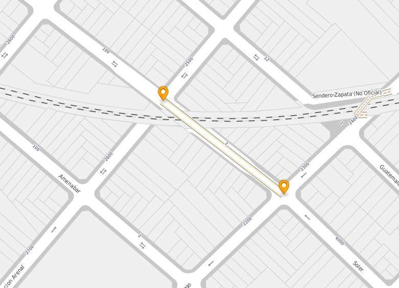 En el plano de mapa.buenosaires.gob.ar, los puntos anaranjados señalan los extremos del antiguo puente. También se observa el tendido ferroviario que atraviesa.