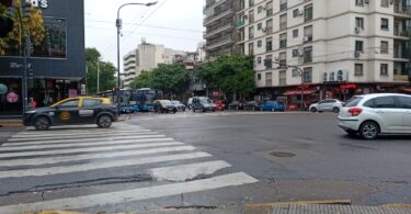 Un adolescente camina por Federico Lacroze y cruza Freire, hacia Zapiola. Tiene puesto un pantalón corto, cuyo escudo es el del club 17 de Agosto.