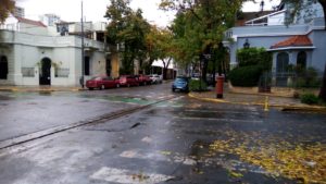 Cruza un barrendero. Su changuito lo aguarda a unos metros, estacionado junto al cordón de la vereda. El empleado municipal tiene un arduo trabajo por delante, considerando la gran cantidad de hojas empapadas por el temporal, que quedaron acumuladas en el suelo. Muy cerca, pasa un perro a la carrera… Comienza a llover otra vez. El cielo plomizo preanunciaba que esto podía llegar a ocurrir. Un muchacho precavido abre su paraguas, una señora se calza una capucha y un repartidor de diarios se encuentra con una labor extra: colocar la mercadería en una bolsa para que el agua de lluvia no la humedezca. Así lo hace, y cuidadosamente, deposita el ejemplar en el umbral de una puerta.