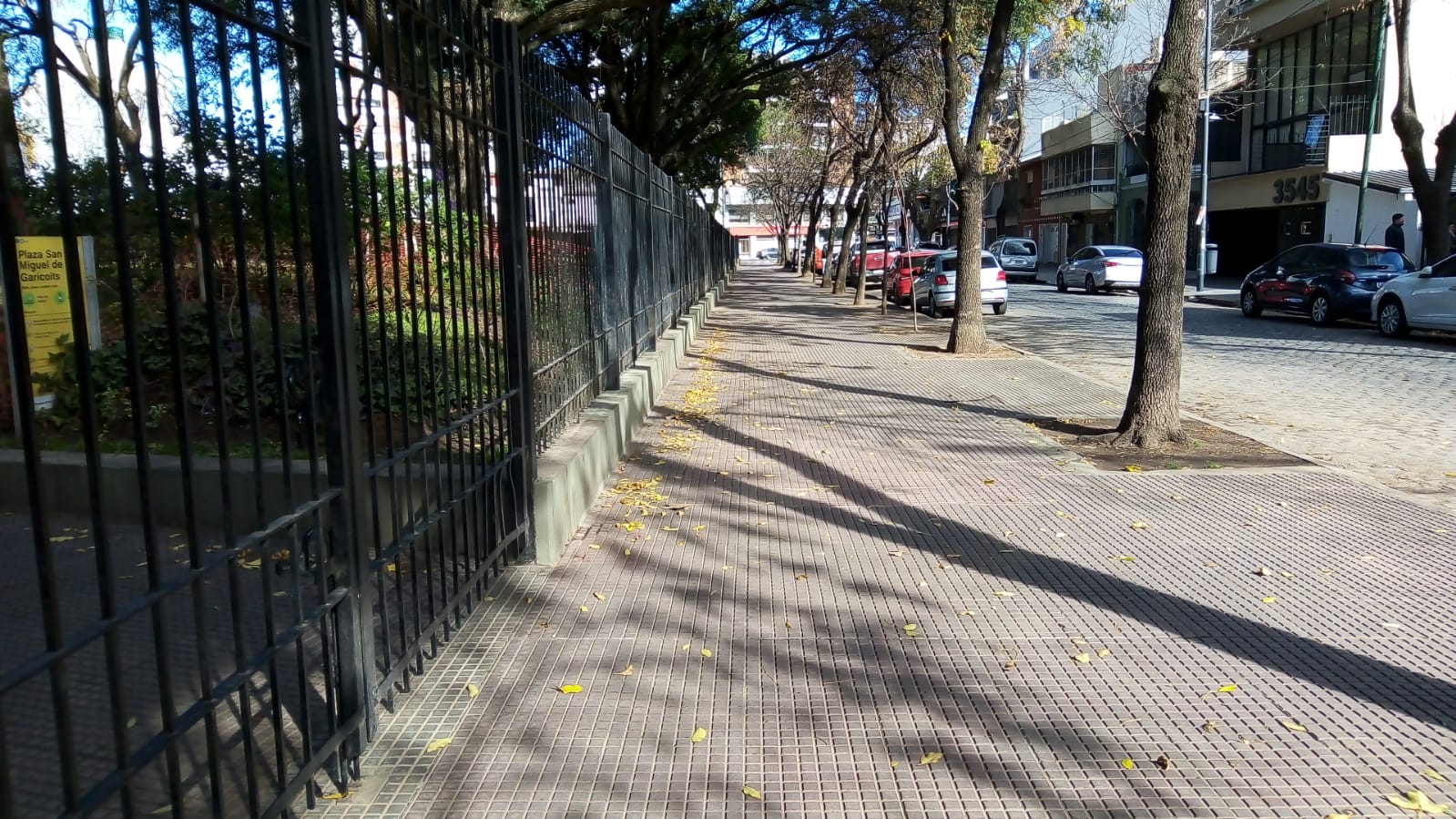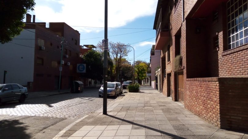 El lateral más tranquilo de la Plaza San Miguel de Garicoits, tiene a Virrey Arredondo como protagonista. Por esta vereda (entre Álvarez Thomas y Delgado) transita poca gente. Tampoco en la acera de enfrente, donde las casas bajas se entremezclan con pequeños edificios, se observa mucho movimiento en este domingo de fines de mayo.